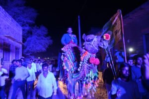 जनसंपर्क के दौरान आरएलपी प्रत्याशी डॉ. विवेक माचरा का ऊंट और घोड़ी पर बिठाकर किया गया स्वागत।